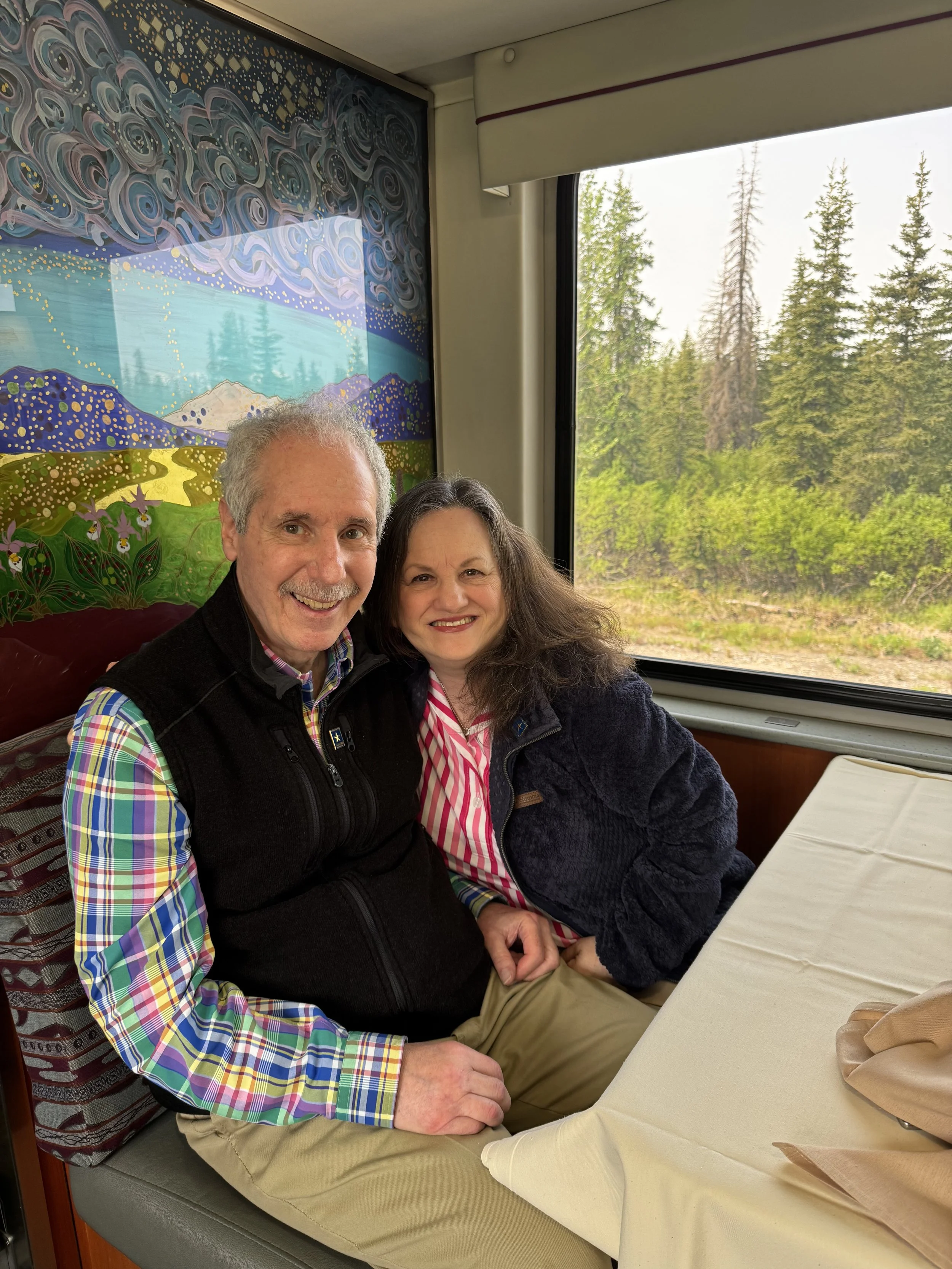Arnee and Sharon June 15, 2025 50th Wedding Anniversary On the train to Denali, Alaska, completing our visits to all 50 United States