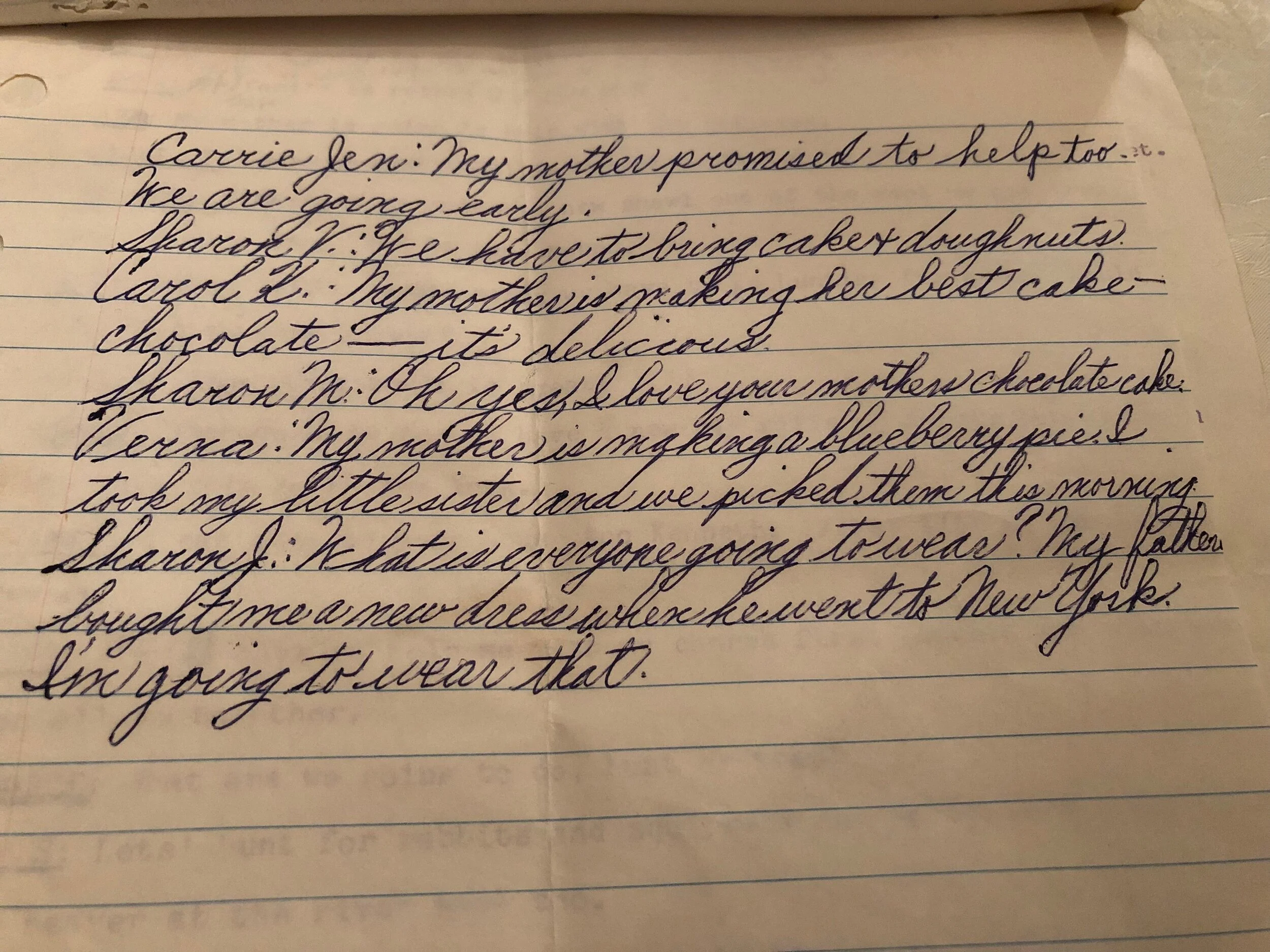A few months later, I was looking through a folder of memorabilia when I came across “long-forgotten purple mimeographed print, a rare specimen!,” as one friend commented, along with handwritten lines of a grammar school play, with parts listed for Ila and others, including Lois DeStefano. Lois, who is close friends with Ila, chatted on Messenger with me and we are looking forward to having lunch sometime soon since she lives within driving distance. Ironically, with the details I remember about some of my other grammar school classmates, I can’t even recall a “Lois” in the class, although she remembers me. I do remember Sharon V., however, who also commented on our chats on social media, and Sharon J., who will be next to track down along with Debra Deasy.