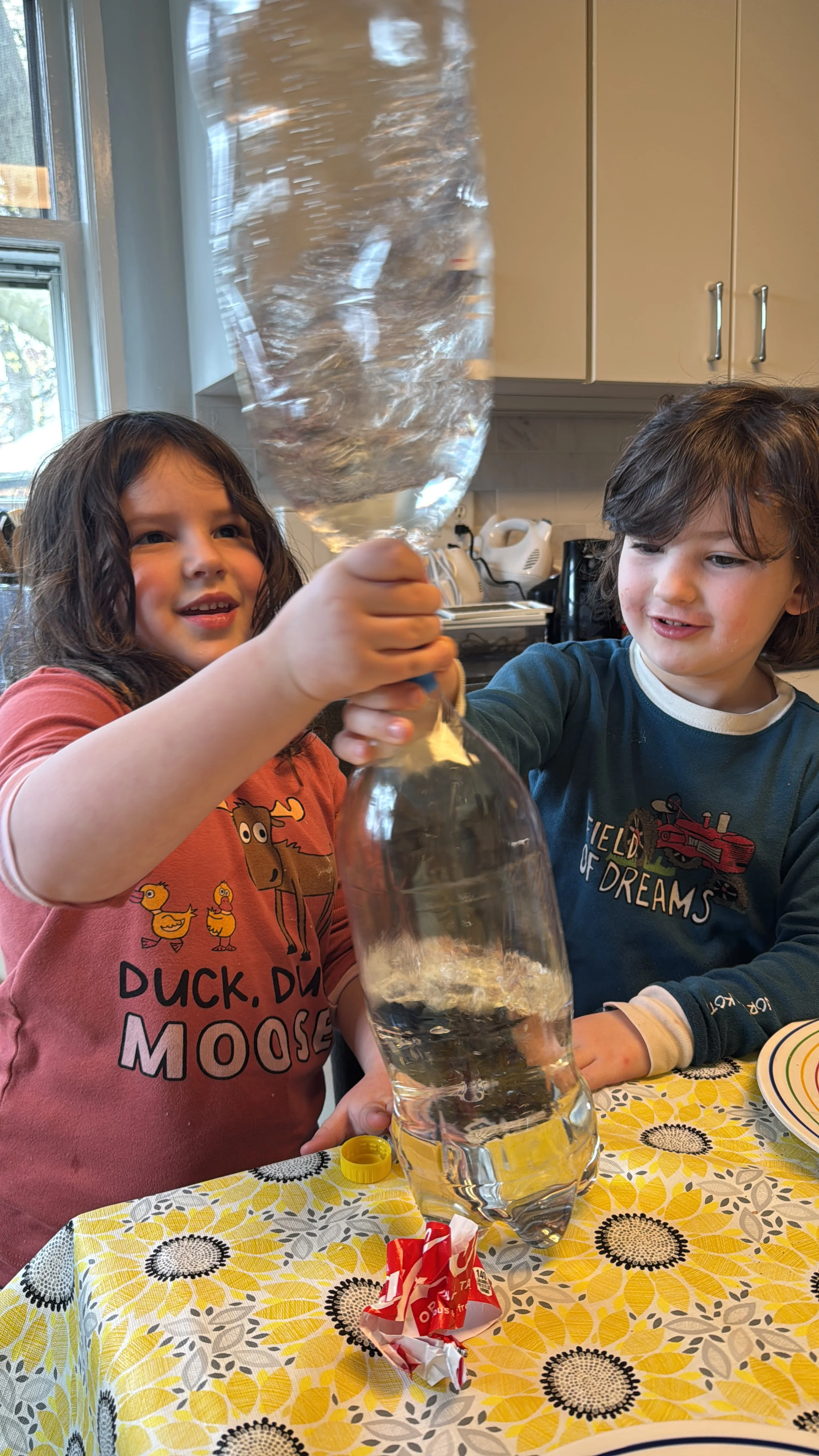 The children had loads of fun experimenting with making a tornado using two empty Coke bottles and some tape. How much “stuff” do we need in the drawers?