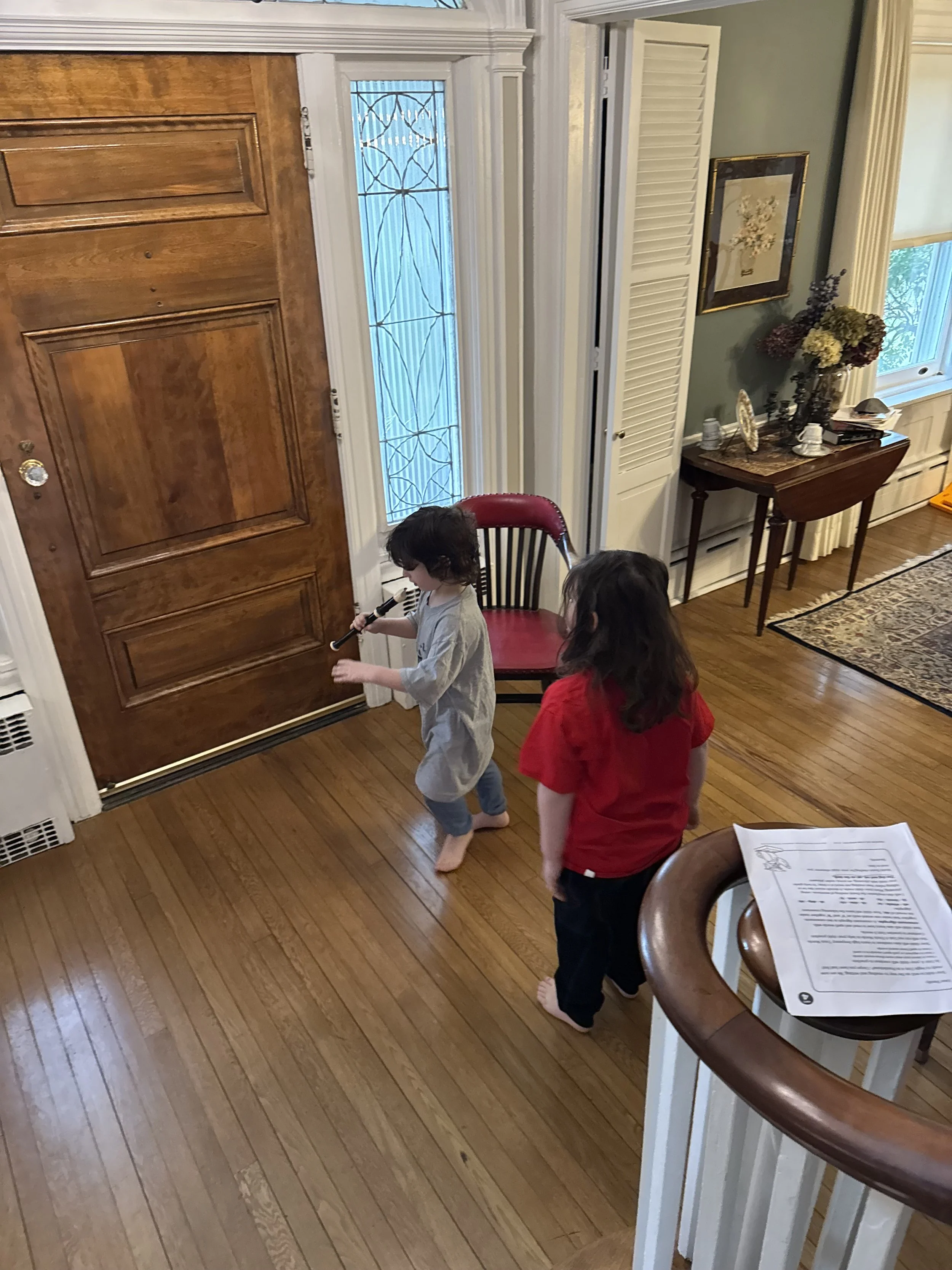 Presto! Just like that! Our grandchildren, Solly and Dizzy, are here from Ohio, spending the week with us in New Jersey, and they wanted a flute. Searching through their daddy’s desk drawers in his childhood bedroom this morning, they were as happy as larks when they found his recorder instrument he played when he was their age. We immediately used it in our marching parade around the house.