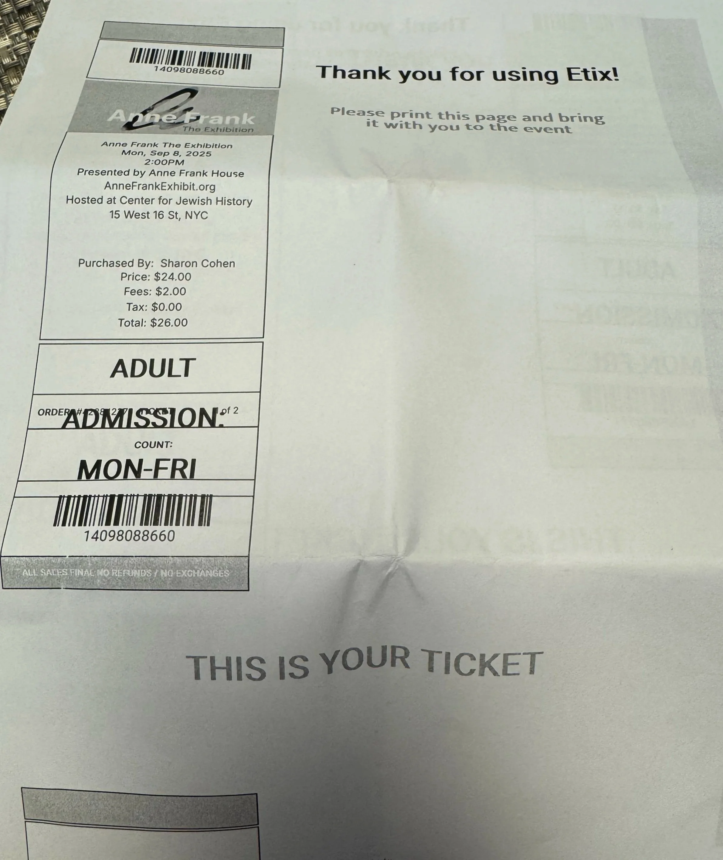 On September 8, 2025 we drove to New York City to see the replica of the Anne Frank Museum in Amsterdam, housed in the Center for Jewish History at 15 W. 16th Street. The well-curated exhibit, featuring a full-size recreation of the Annex, opened on January 27, 2025, on International Holocaust Remembrance Day.