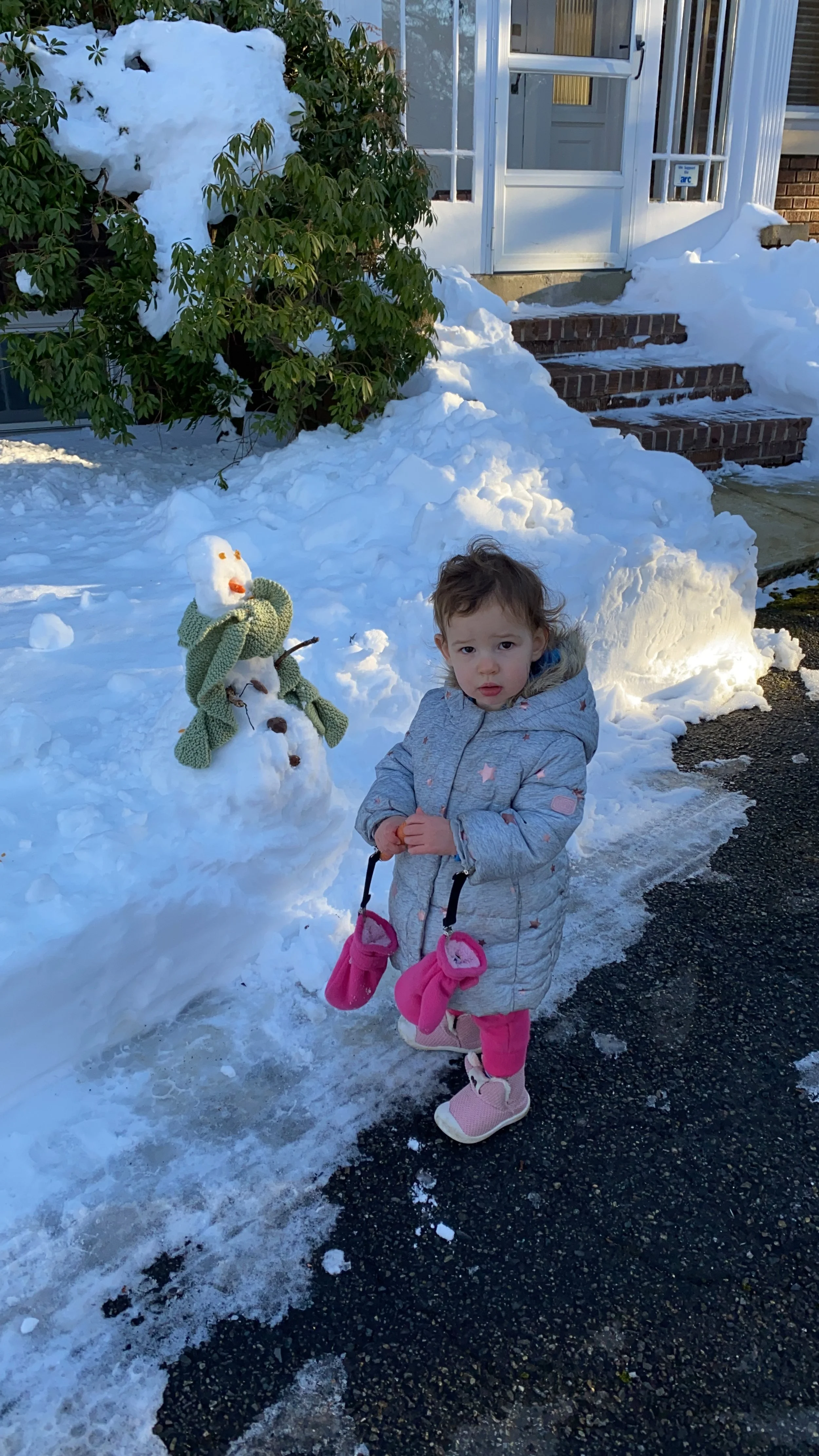 While babysitting, Grandma took Solly out to build her first snowman at our house in South Orange, New Jersey
